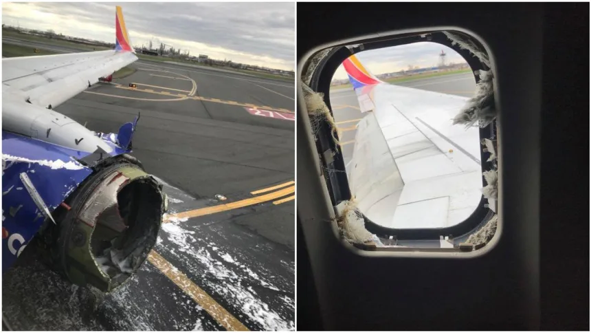 Video shows what appears to be a blown-out window and shredded engine on Southwest Flight 1380 at Philadelphia International Airport.