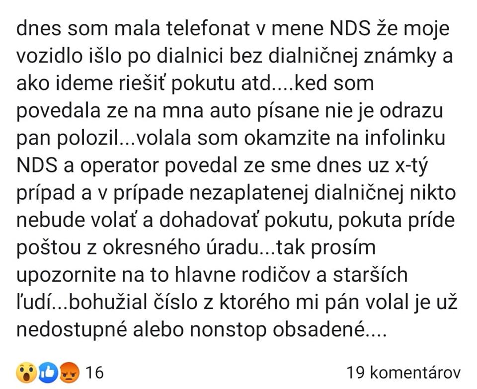 „Dnes som mala telefonát v mene NDS, že moje vozidlo išlo po diaľnici bez diaľničnej známky a ako ideme riešiť pokutu atď….keď som povedala, že na mňa auto písané nie je, odrazu pán položil,“ píše sa v statuse.