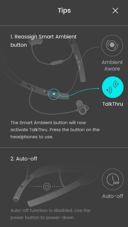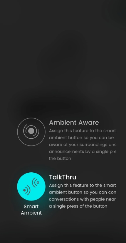 Po otvorení aplikácie môžete v samotnom strede obrazovky nájsť údaj o momentálnom stave batérie, pod ktorým sa nachádzajú dve samostatné ikony. Jedna z nich odkazuje na možnosť zmeny funkcionality tlačidla, ktoré štandardne slúži na aktiváciu Ambient Aware. Namiesto nej si totiž môžete na toto tlačidlo nastaviť aktiváciu funkcie TalkThru, ktorá zvýrazní hlasy ľudí okolo vás.