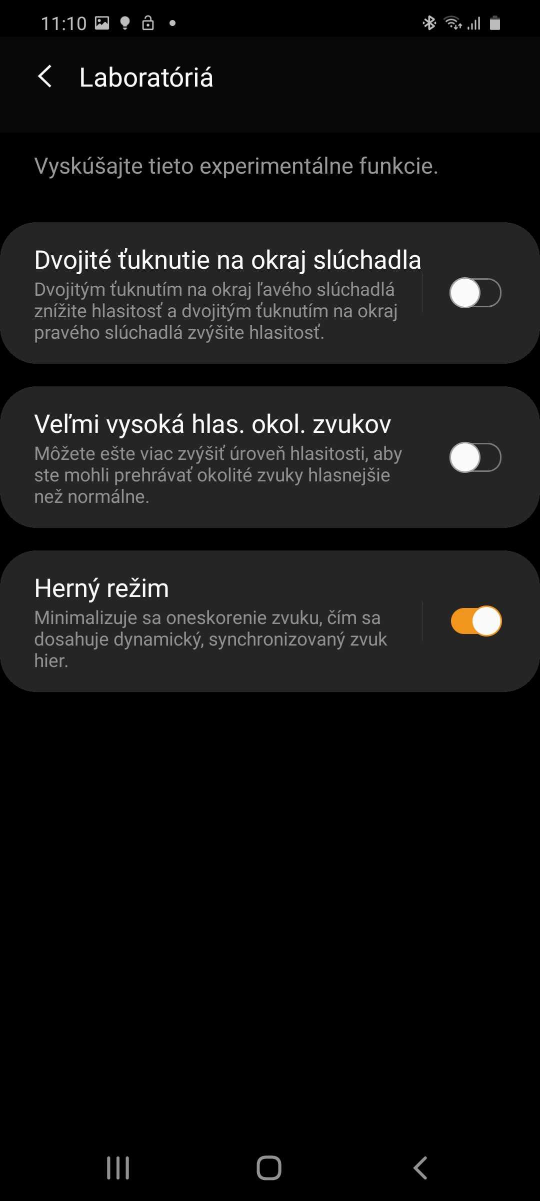 Najväčším vylepšením je možnosť pozrieť si, koľko percent batérie ostáva v nabíjacom puzdre. KONEČNE. V aplikácii okrem iného môžete nájsť aj sekciu Laboratóriá, v ktorej sa nachádzajú experimentálne funkcie. Mňa najviac po nie úplne najlepších skúsenostiach s latenciou zaujala funkcia Herný režim, ktorá latenciu znižuje na minimum. To je perfektné hlavne pri hraní rýchlych hier ako PUBG Mobile či Call of Duty.