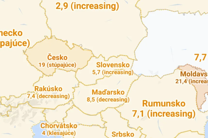 Okrem toho mapa zobrazuje počet nových prípadov na 100 000 obyvateľov (7-dňový priemer), pri ktorom uvádza, či má výskyt nákazy stúpajúcu, alebo klesajúcu tendenciu.