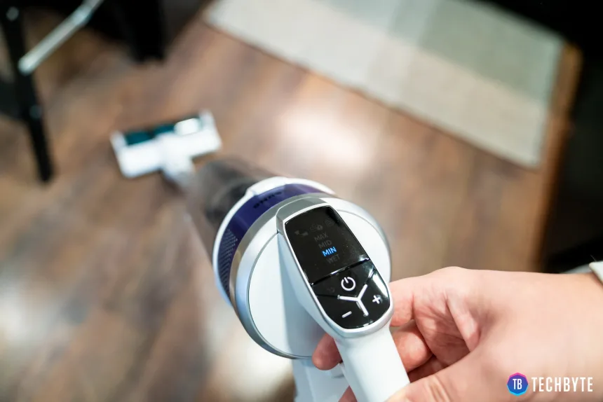 Tiež tu nájdete pekne čitateľný digitálny displej, ktorý vás informuje o stave batérie, chybových hláseniach a zvolenom režime výkonu. Na výber máte z troch, označené ako MIN, MED a MAX. Vysávač takisto obsahuje aj režim WET, ktorý zvolíte vtedy, keď chcete vysávač premeniť na mop. Áno, Jet 70 obsahuje funkciu 3v1 – vysávanie, ručné vysávanie a mop. Hneď nad displejom sa nachádzajú 3 tlačidlá pre zapnutie/vypnutie a pre pridávanie/uberanie výkonu. Ich umiestnenie je veľmi praktické, dočiahnete na ne svojím palcom kedykoľvek budete chcieť.
