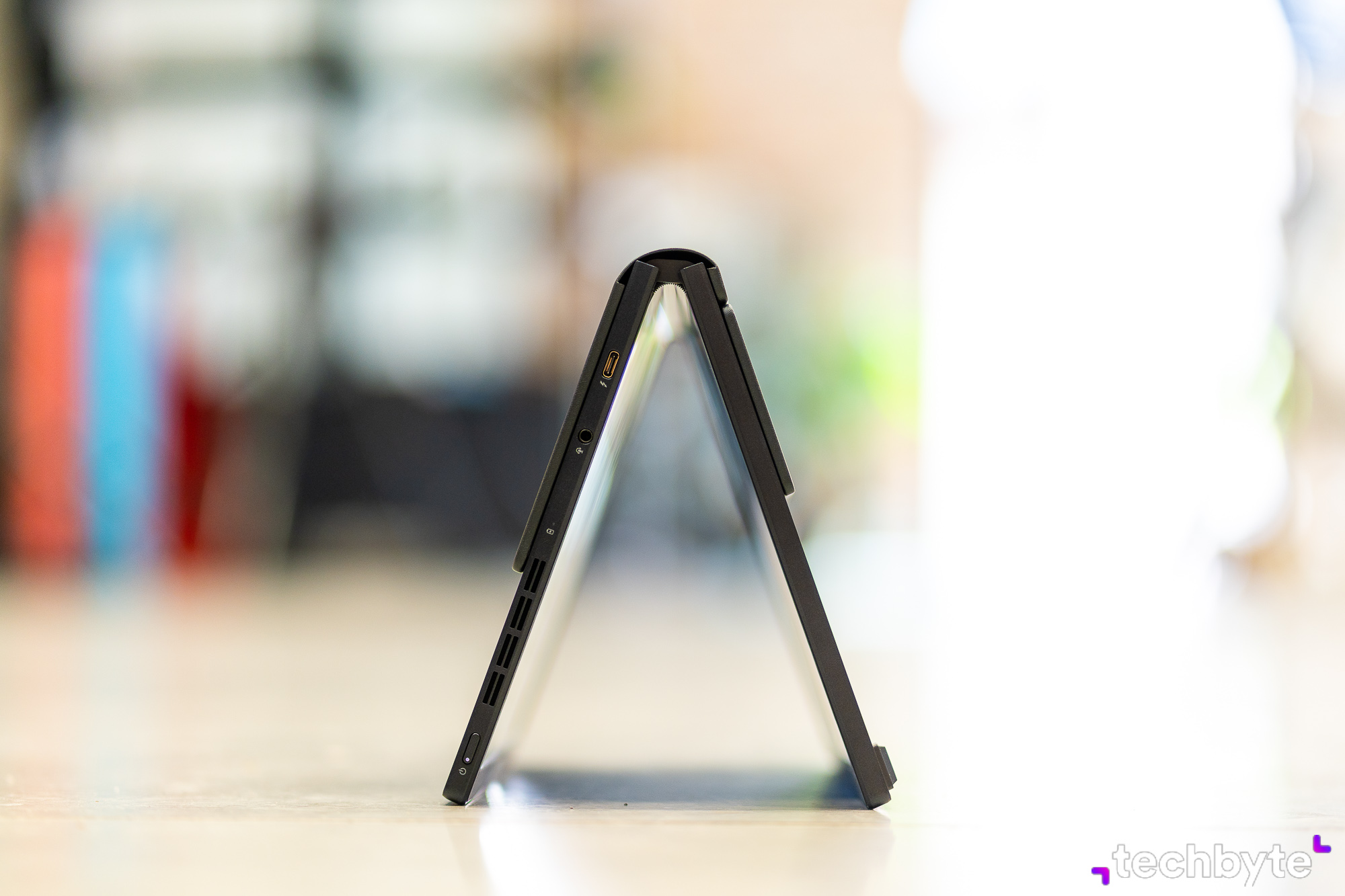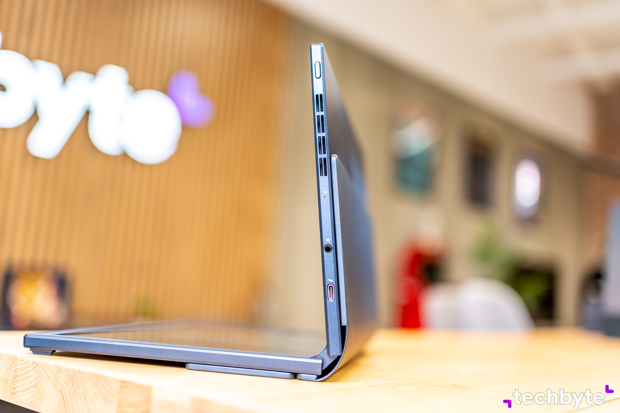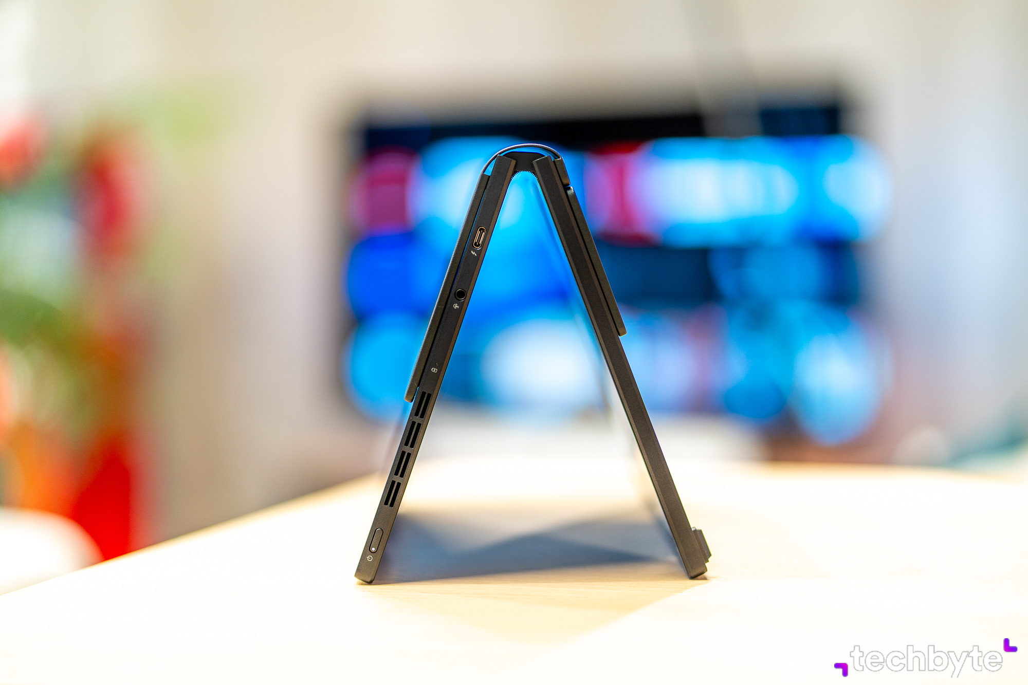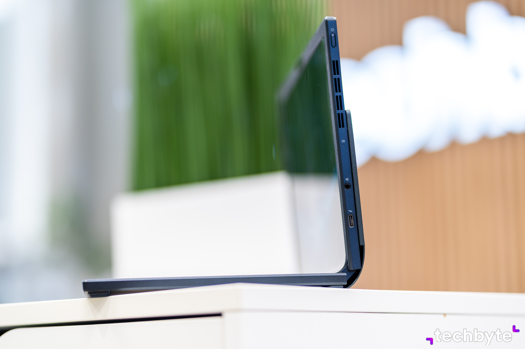 Je len na vás, či ho budete používať ako „klasický“ notebook v zmysle „ohnem ho do 90-stupňového uhla“ a pracujem – alebo – displej rozprestriete úplne, podopriete ho zabudovanou nožičkou a pripojíte bezdrôtovú klávesnicu. Týmto štýlom namiesto 12,5-palcového displeja získate prístup k až 17,3-palcovej obrazovke s jasom 500 nitov a 100 % pokrytím DCI-P3. Vďaka Pantone certifikácii sa môžete spoľahnúť na presné farby.