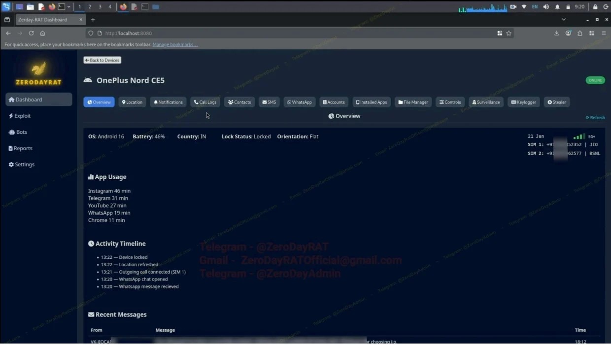 Človek ovládajúci malvér má k dispozícii prehľadný riadiaci panel, kde vidí všetky dôležité a hlavne citlivé dáta. Medzi ne napríklad patrí zoznam napadnutých zariadení aj s modelom telefónu, verziou operačného systému, stavom batérie, detailmi SIM karty, krajinou a informáciou o tom, či je zariadenie zamknuté. Panel zároveň zobrazuje históriu používania aplikácií, časové osi aktivity a výmenu SMS správ. To všetko v reálnom čase.