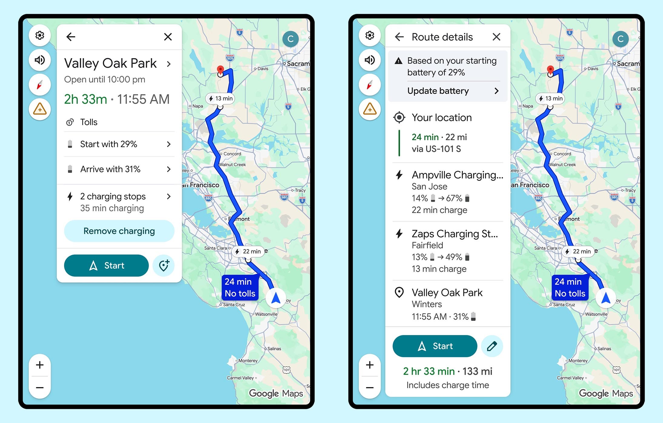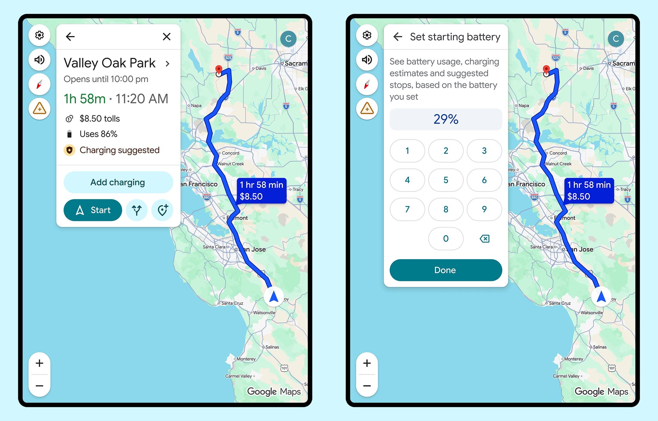 Po pripojení telefónu cez Android Auto a zadaní cieľa sa v navigácii objaví nové tlačidlo na pridanie nabíjania. Používateľ najprv zadá aktuálne percento batérie. Google Mapy potom s pomocou umelej inteligencie vypočítajú, kde bude potrebné zastaviť na nabíjanie, aký bude stav batérie pri príchode do cieľa a koľko času strávi vodič na nabíjačke.