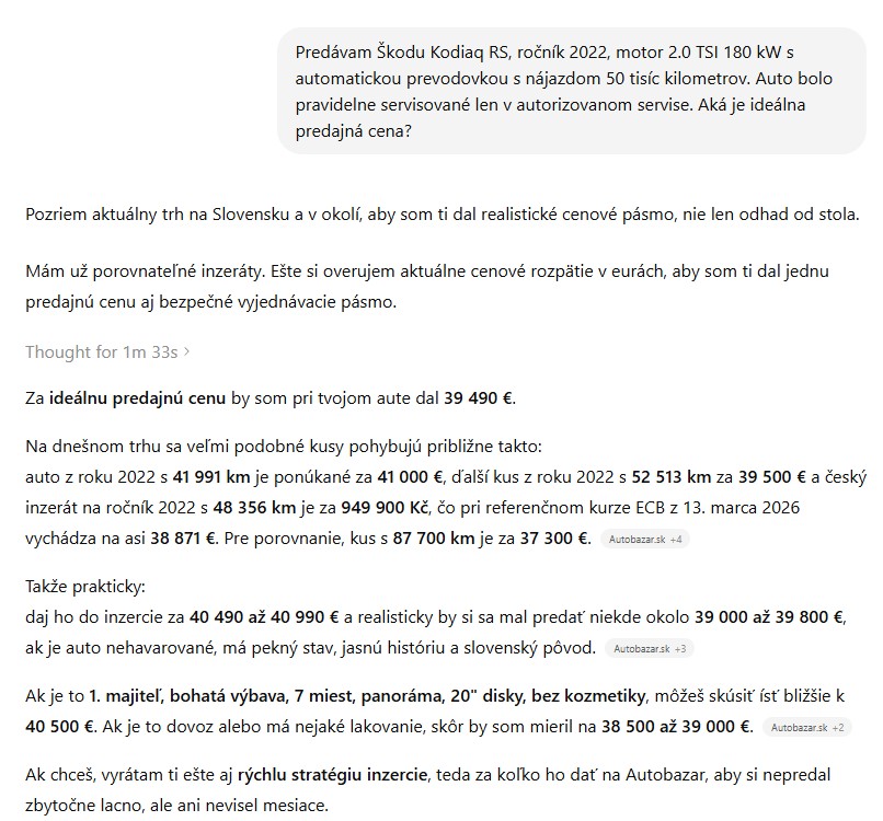 Rozdiel medzi všeobecnou otázkou a dobrým promptom je pritom obrovský. Ak sa niekto spýta len to, za koľko sa predáva konkrétny model, dostane veľmi hrubý odhad. Ak však doplní presné parametre, AI už vie lepšie odhadnúť, kde sa vozidlo na trhu nachádza a čo môže hrať v jeho prospech alebo proti nemu.