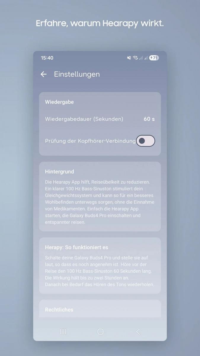 Samsung vydal bezplatnú aplikáciu Hearapy, ktorá má pomôcť ľuďom trpiacim kinetózou, teda nevoľnosťou pri cestovaní, a to bez liekov, len prostredníctvom zvuku prehrávaného cez slúchadlá.